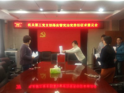 按照区委组织部《关于落实管党治党责任开展“三个一”专项工作的通知》精神,机关第三党支部于12月19日召开落实管党治党责任征求意见会。本次征求意见会采取不记名填写调查表的方式,分别对地区工委办事处班子成员、机关党总支和机关第三党支部围绕落实管党治党责任征求支部全体党员意见。